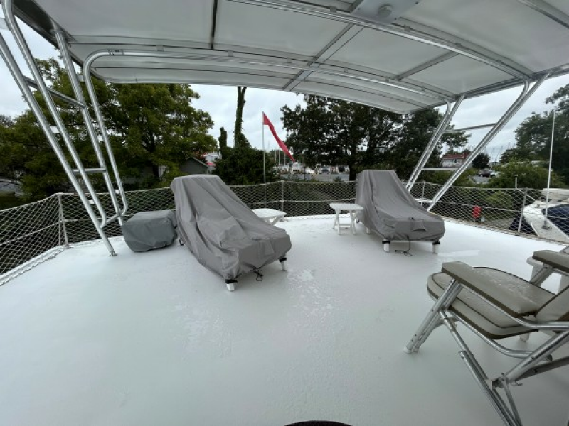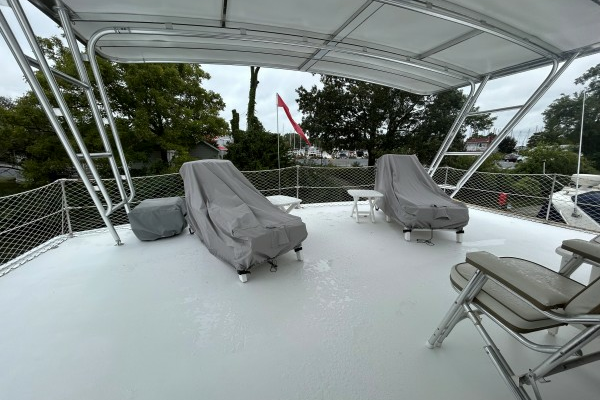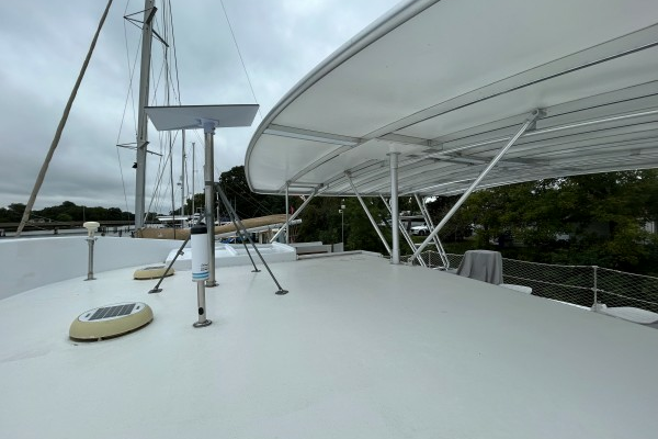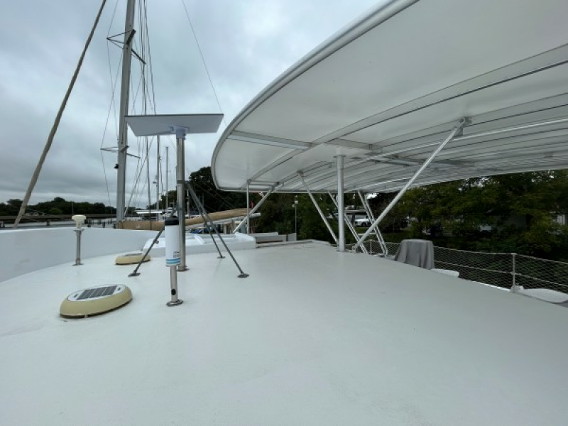 The boat top deck supports Atlantic Towers fiberglass and aluminum top, carrying 10 solar panels, radar and KVH HD7 dish. The spacious boat deck is likely to be the outside social area of choice at anchor or in port.