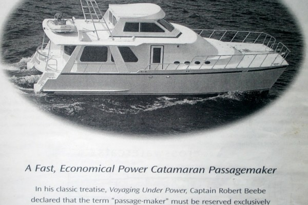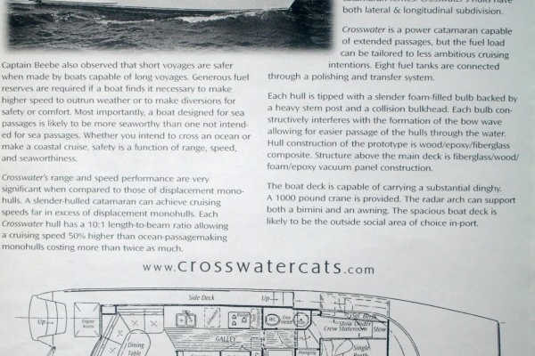 An economical power catamaran passagemaker. With a range capability of 5000 nautical miles at 8 knots, Crosswater exemplifies the qualities of a true "passage-maker".